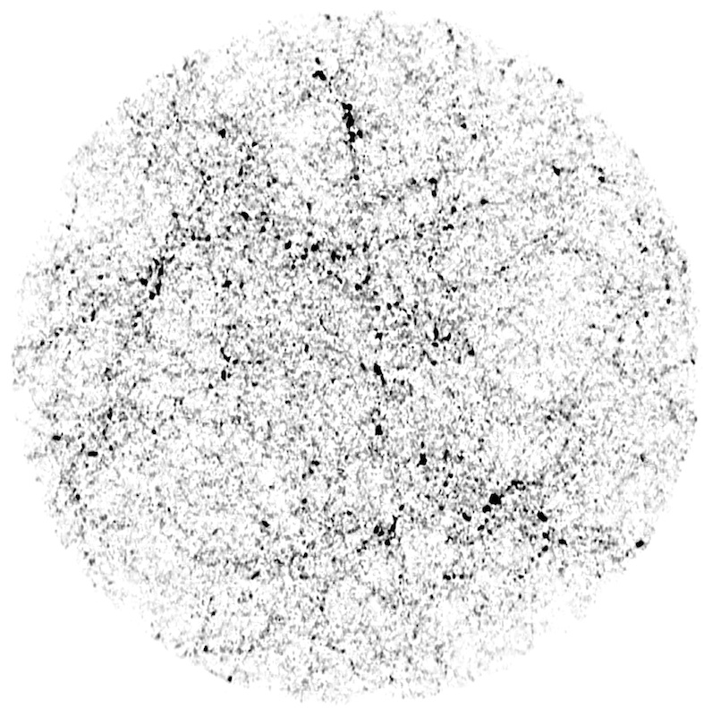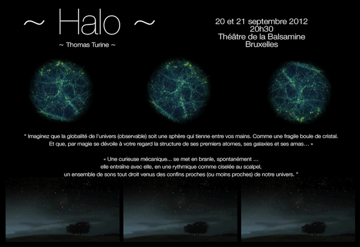 Halo is both a spatialized electro-acoustic improvisation of sounds from the universe and a video installation immersing the viewer in the meanders of models of the probable structures of dark matter in the universe.
